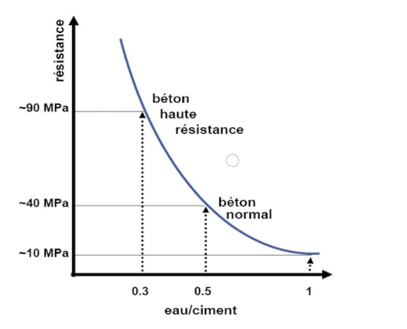 En effet, les scientifiques on montré que la résistance du béton est inversement proportionnelle au rapport E/C, désignant la masse d'eau divisée par la masse de ciment. Lorsque la quantité d'eau augmente, la résistance du ciment diminue. Cette relation peut être visualisée par le graph ci dessous.