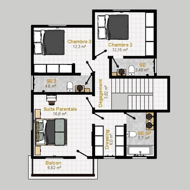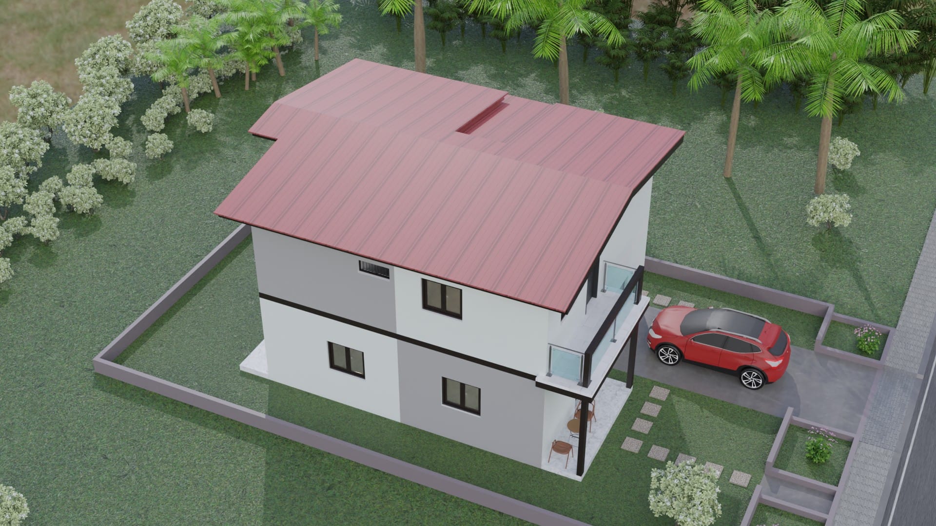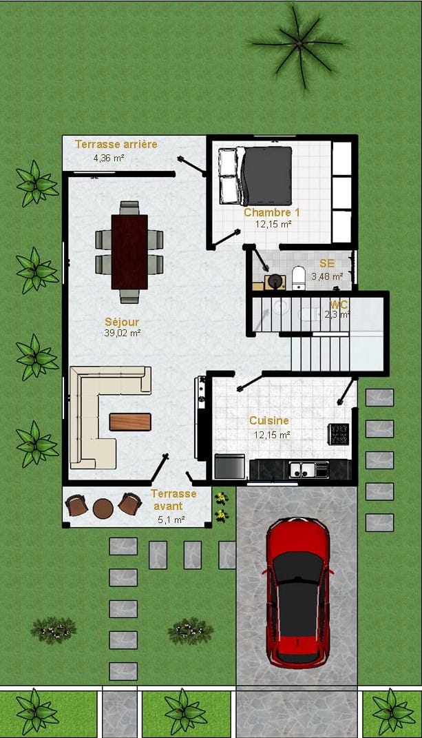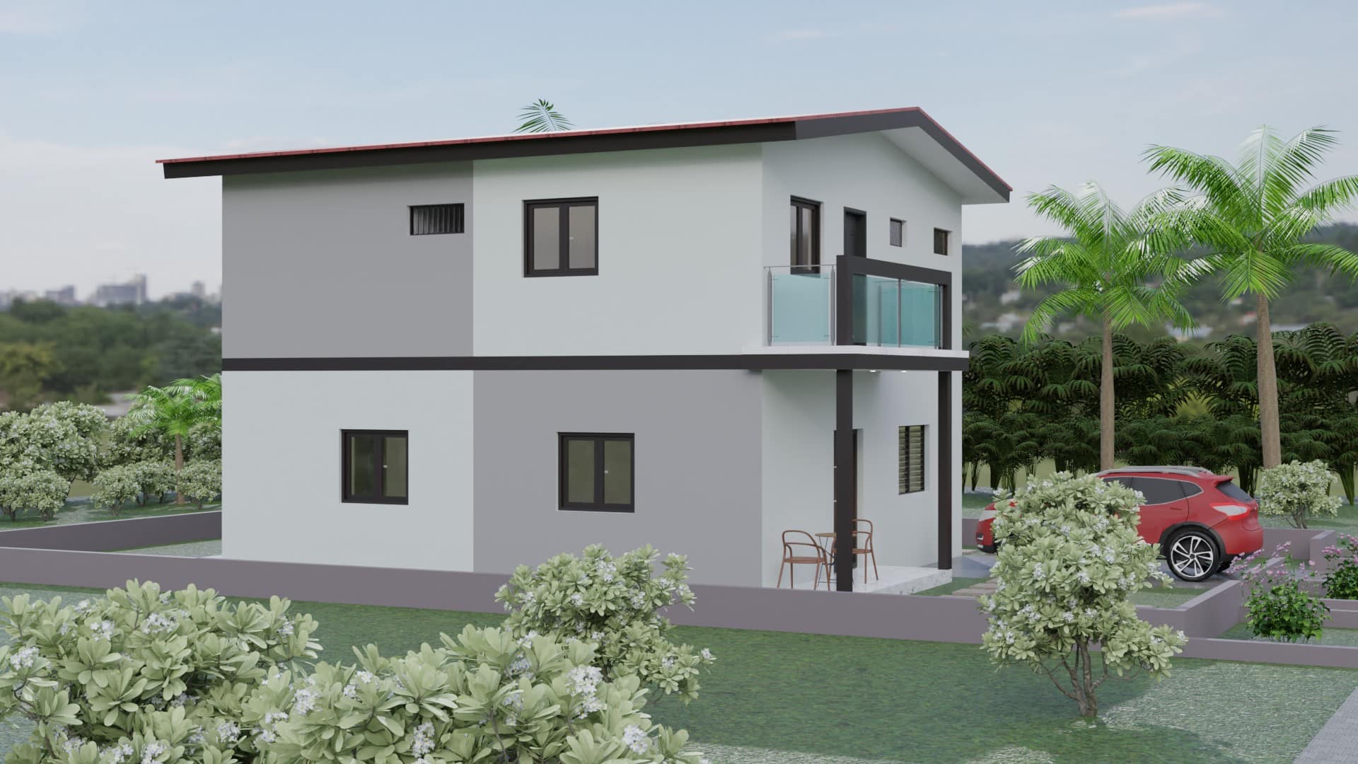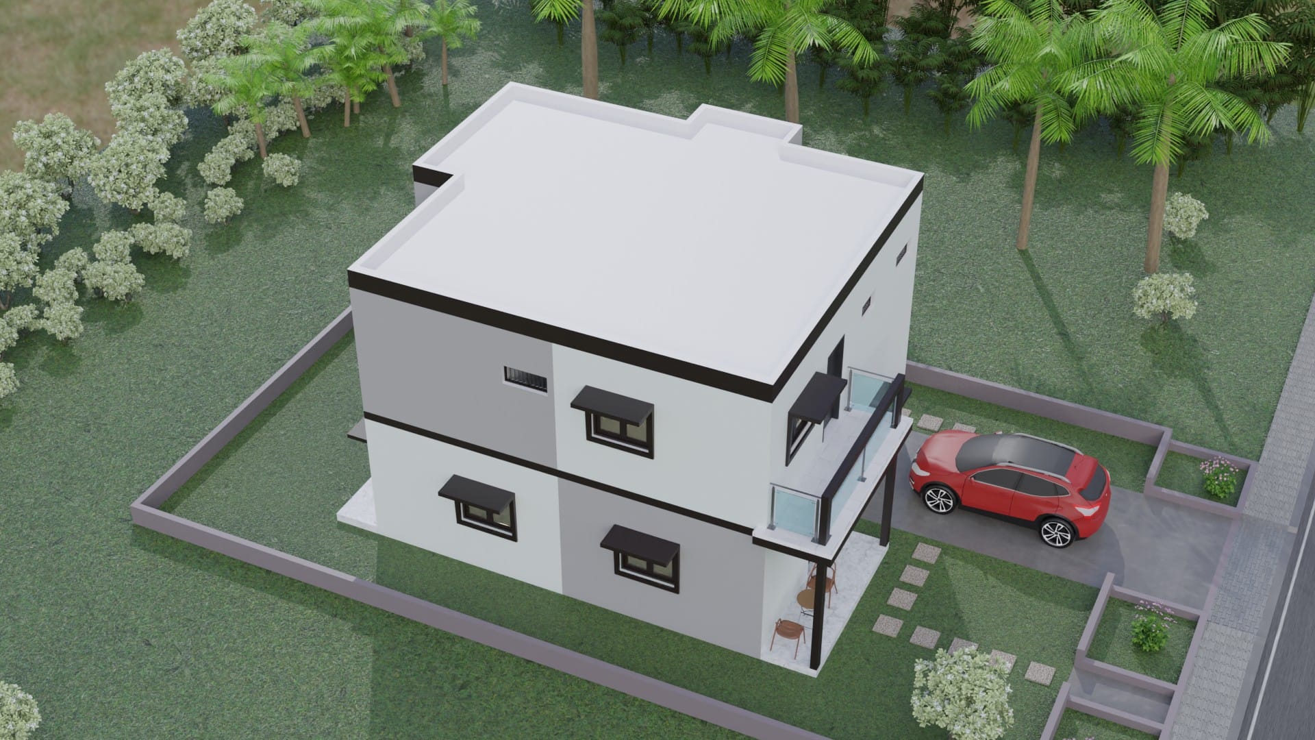 Cette dernière se distingue de la précédente par sa toiture terrasse de 68 m² et ses brise-soleil aux fenêtres.